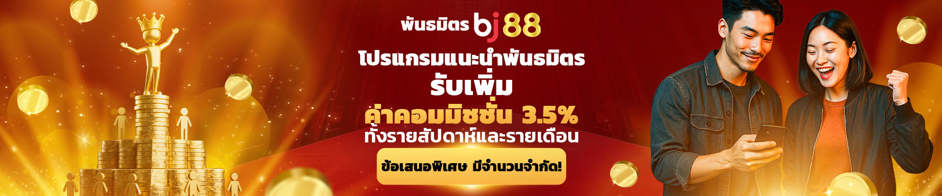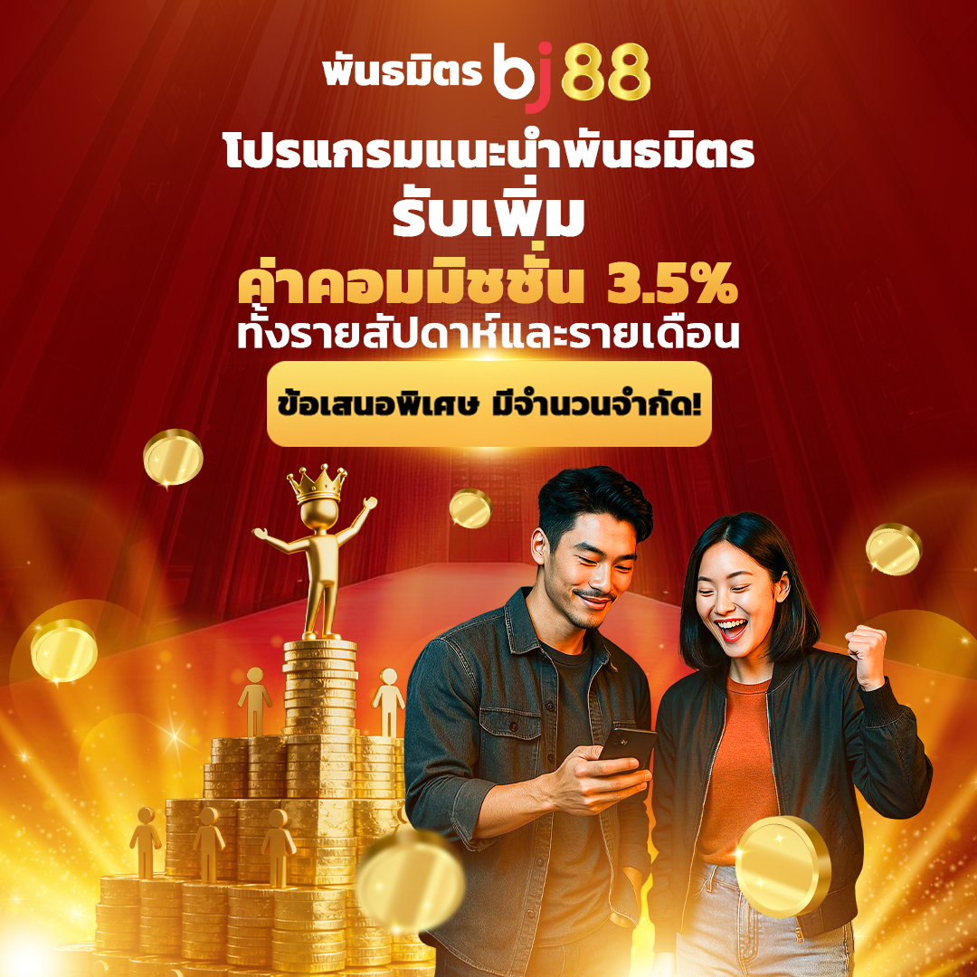 แนะนำ BJ88 ให้เพื่อนและครอบครัวของคุณ พร้อมขยายเครือข่ายพันธมิตรของเรา ร่วมเป็นส่วนหนึ่งในการเติบโตอย่างต่อเนื่องกับ BJ88 และเพื่อเป็นการขอบคุณ คุณจะได้รับโบนัสเพิ่มอีก 3% รวมกับค่าคอมมิชชั่นรายสัปดาห์และรายเดือน เมื่อผู้ที่คุณแนะนำเข้ามาเข้าร่วมโปรแกรมพันธมิตรกับเรา