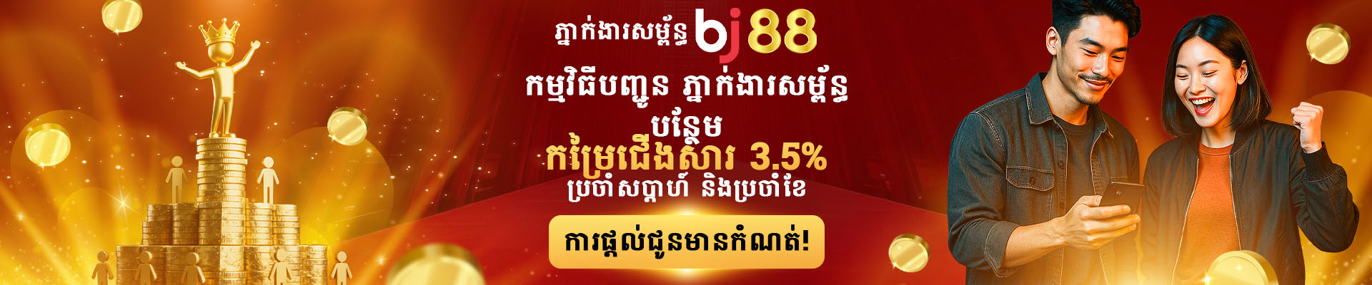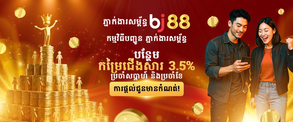 រួមចំណែកក្នងការរីកចម្រើនបន្តរបស់ BJ88 ហើយដើម្បីជាការអរគុណ ក៏ទទូលបានប្រាក់បន្ថែម3% លើកម្រៃជើងសារប្រចាំសប្ដាហ៏ ប្រចាំខែ របស់អ្នក នៅពេលដែលអ្នកបានណែនាំ ចូលរួមក្នុងកម្មវិធីដៃគូរបស់យើង។