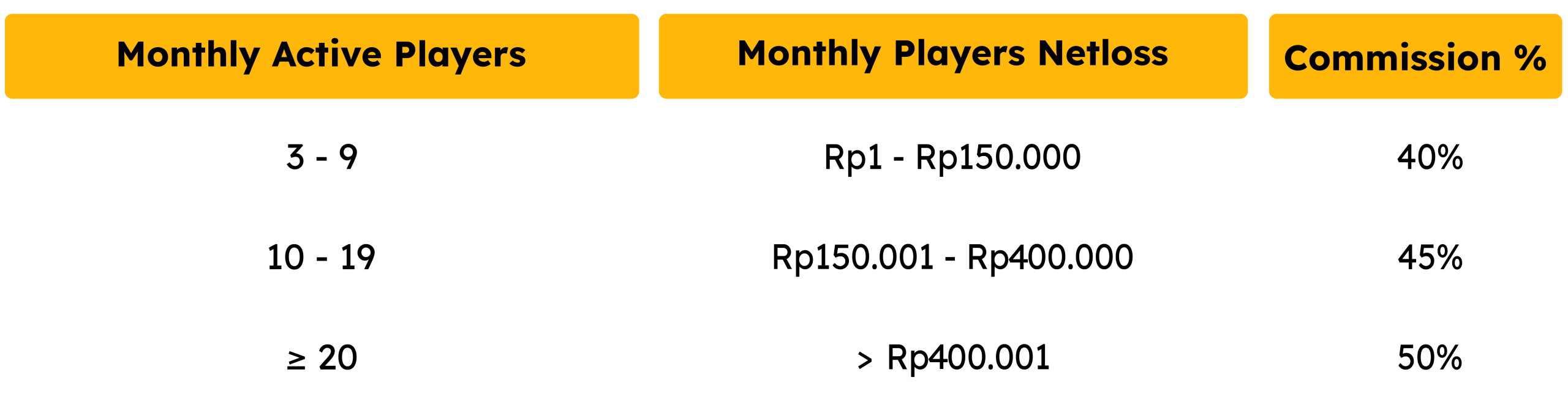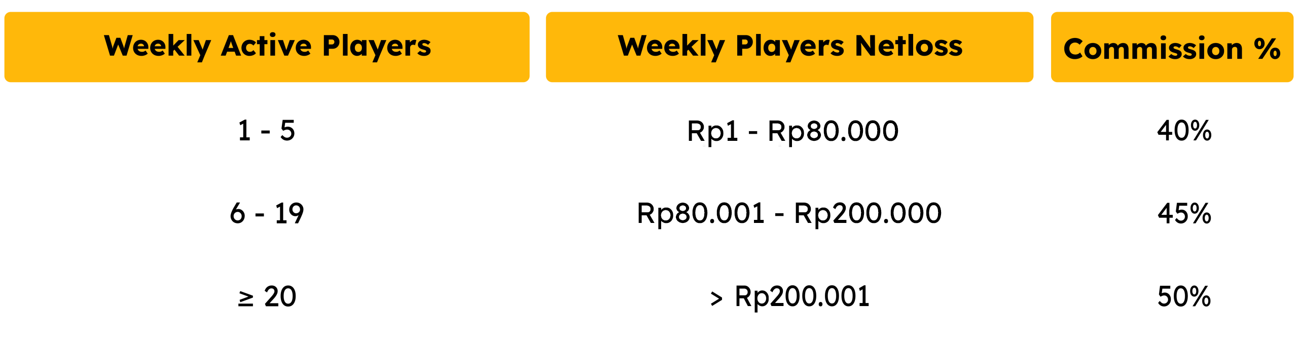 The affiliate commission ranges from 40% to 50%, depending on whether you choose the weekly or monthly plan. Specific active player requirements and net loss conditions will apply.