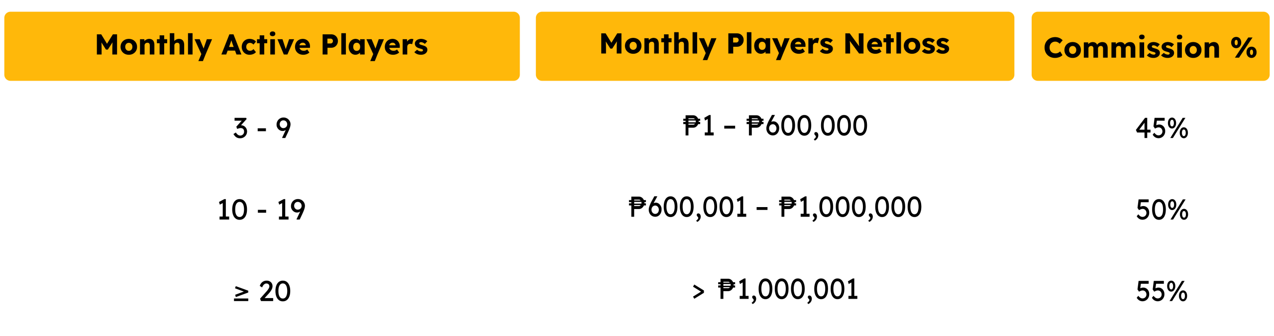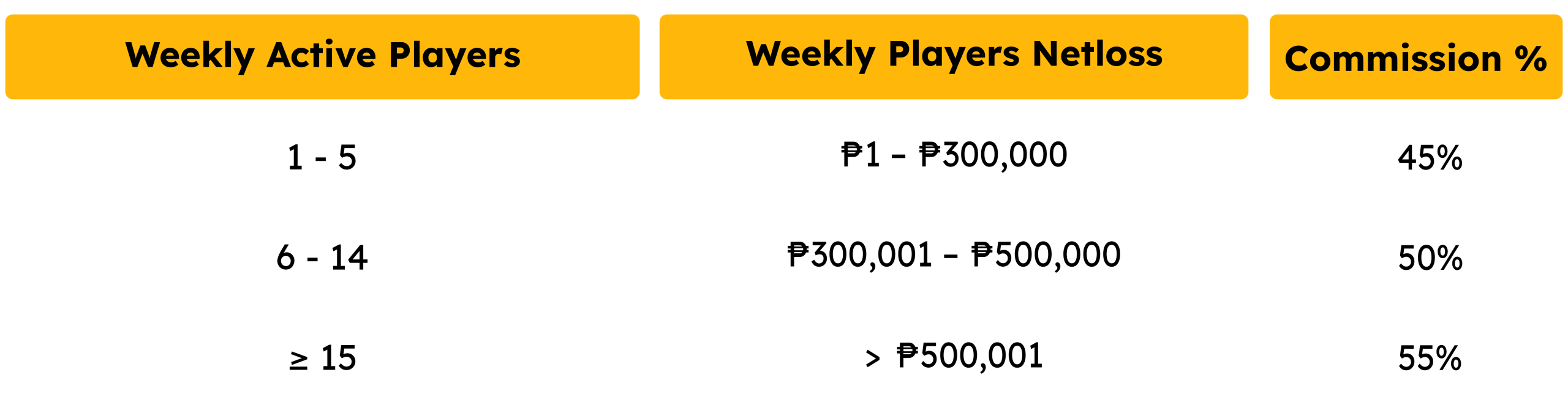 5. The affiliate commission ranges from 45% to 55%, depending on whether you choose the weekly or monthly plan. Specific active player requirements and net loss conditions will apply.