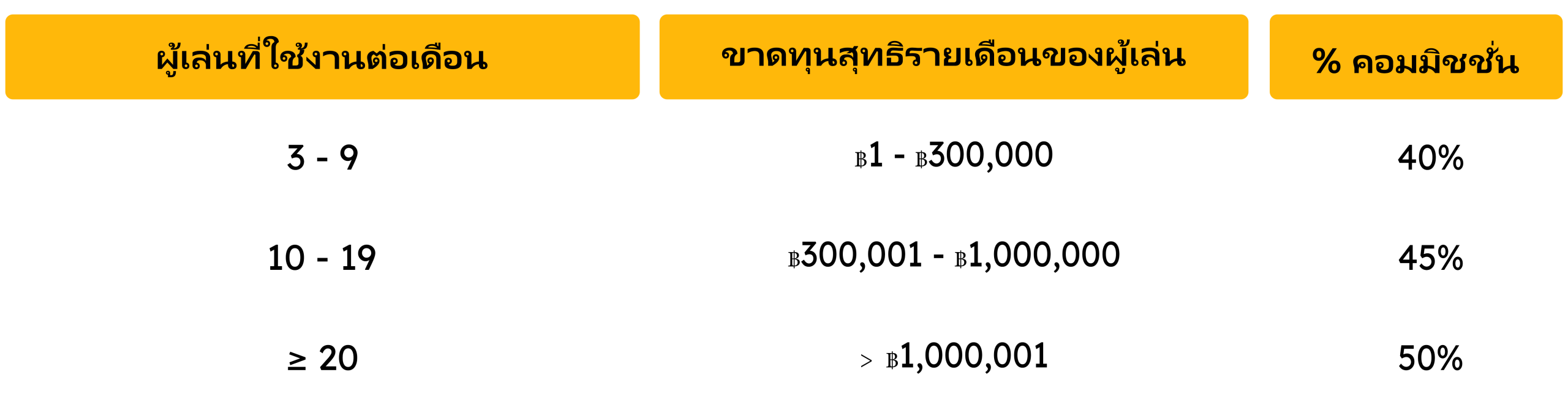ค่าคอมมิชชั่นสำหรับพันธมิตรอยู่ระหว่าง 40% ถึง 50% ขึ้นอยู่กับว่าคุณเลือกแผนรายสัปดาห์หรือรายเดือน จะมีเงื่อนไขเพิ่มเติมเกี่ยวกับจำนวนผู้เล่นที่ใช้งาน และยอดขาดทุนสุทธิที่ต้องเป็นไปตามกำหนด