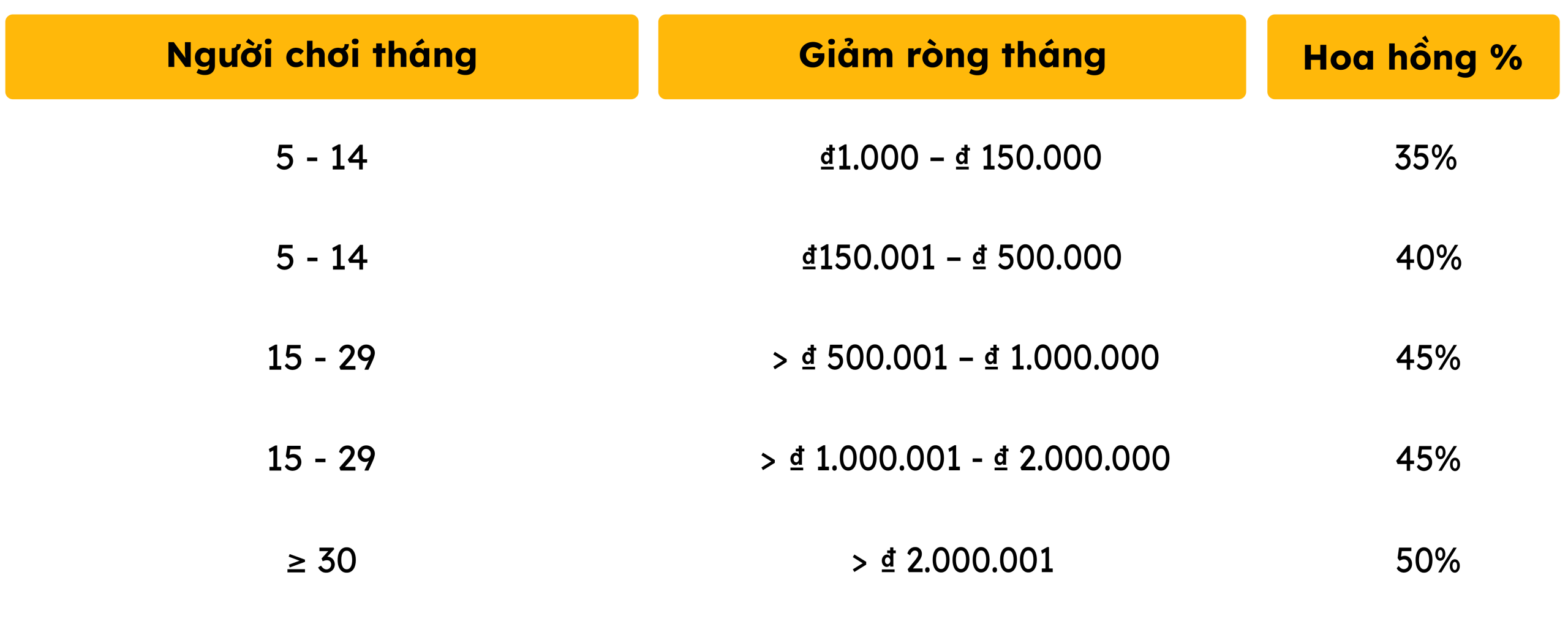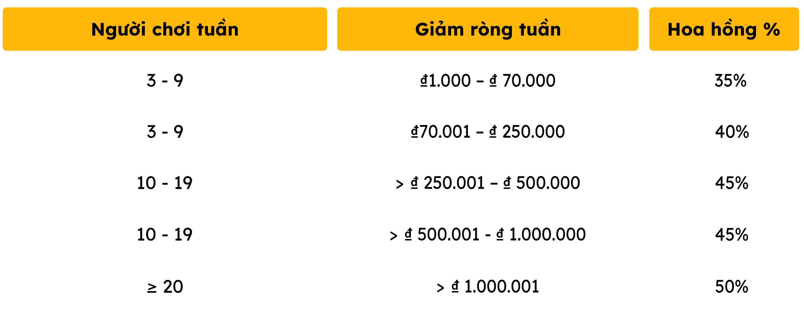 Tỷ lệ hoa hồng đại lý dao động từ 35% đến 50%, tùy thuộc vào việc bạn chọn kế hoạch tính hàng tuần hay hàng tháng. Yêu cầu cụ thể về người chơi hoạt động và điều kiện lỗ ròng sẽ được áp dụng.