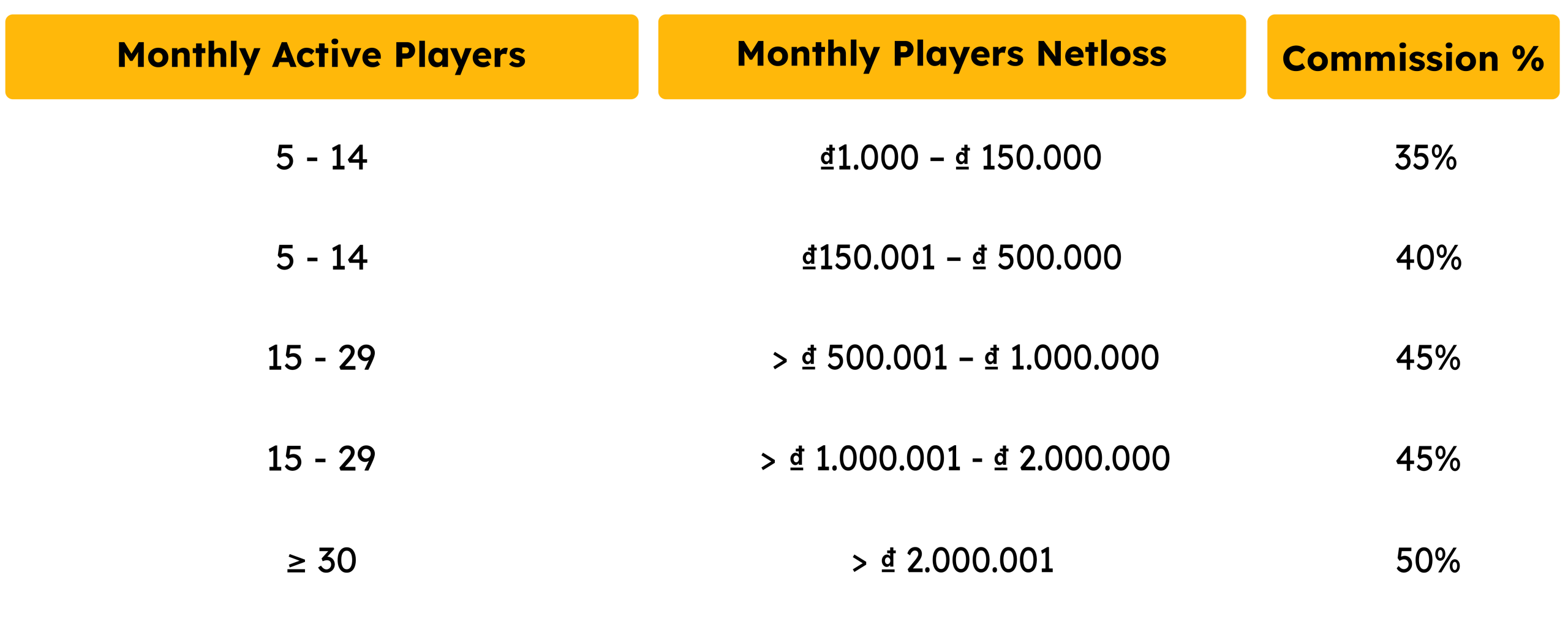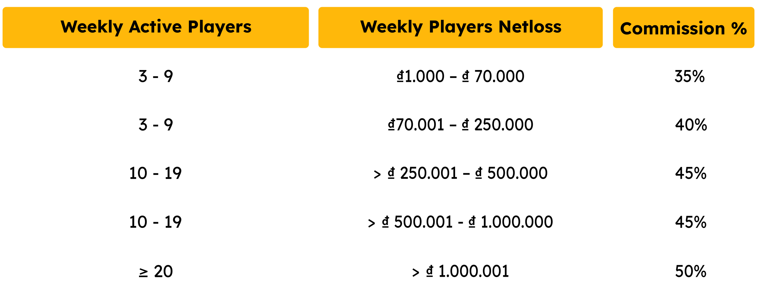 The affiliate commission ranges from 35% to 50%, depending on whether you choose the weekly or monthly plan. Specific active player requirements and net loss conditions will apply.